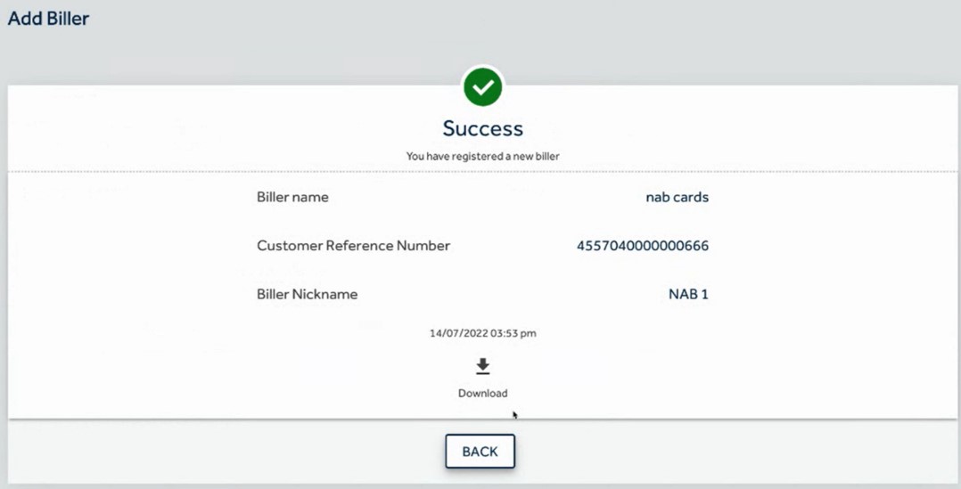 - You will be shown the details of the new Biller and asked to authorise, using a One Time Passcode, which will be sent to the registered mobile number.